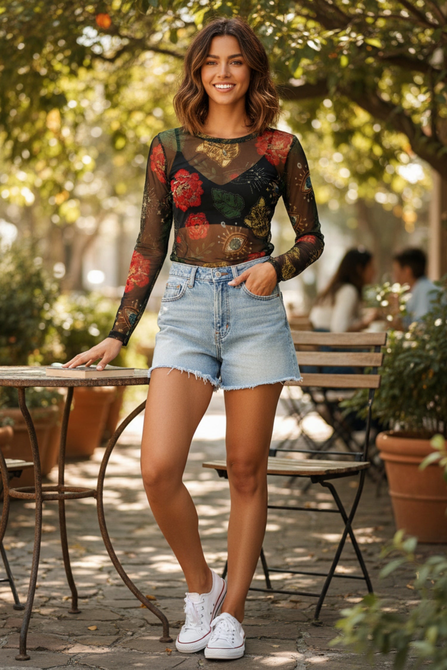 Long-sleeved mesh blouse in a mystic print